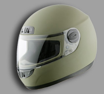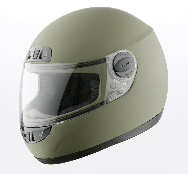 Casco integrale con calotta esterna in materiale termoplastico HI100H e calotta interna in polistirolo a doppia densità per un migliore assorbimento degli urti. Rivestimento interno in tessuto anallergico. Visiera trasparente ad iniezione con trattamento antigraffio, spessore 2,2 mm. applicata ad un meccanismo in ABS.