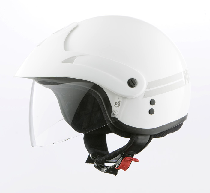 Visiera trasparente ad iniezione con trattamento antigraffio, spessore 2,2 mm. applicata insieme al frontino in ABS verniciato mediante delle viti in nylon.