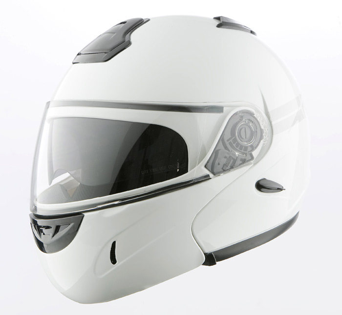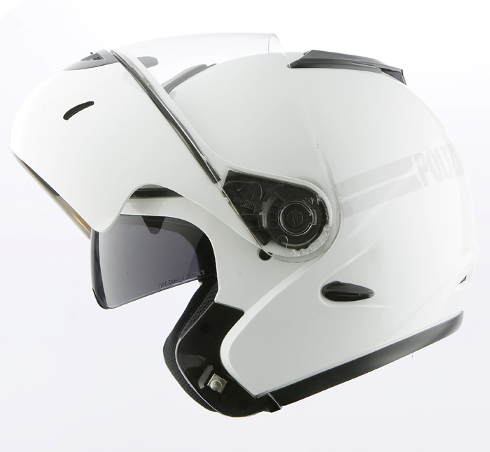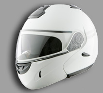 Casco modulare con calotta esterna in materiale termoplastico HI100H e calotta interna in polistirolo a doppia densità per un migliore assorbimento degli urti. Rivestimento interno in tessuto anallergico. Visiera trasparente ad iniezione con trattamento antigraffio, spessore 2,2 mm, applicata ad un meccanismo in abs.